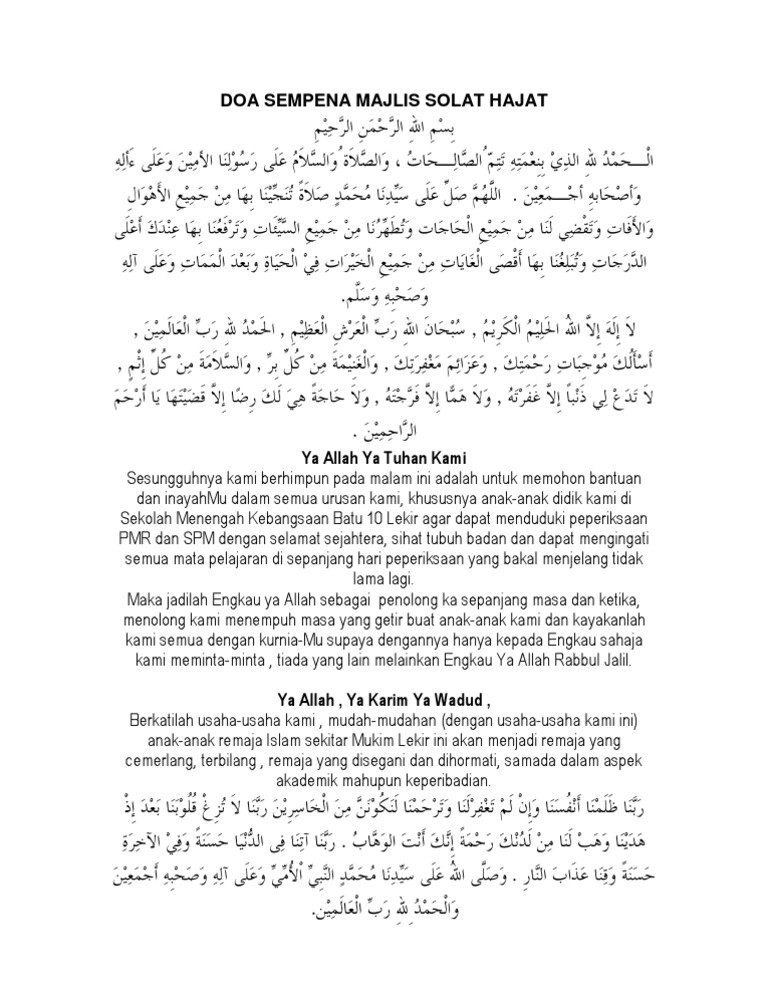 Kertas Kerja Bacaan Yasin Dan Solat Hajat Upsr 2014 1435h from imgv2-2-f.scribdassets.com Dianjurkan sebelum itu untuk memperbanyak istighfar dan dzikir kepada allah subhaanaahu wa ta'aalaa. Perlu di pahami yang di maksud dengan hajat di sini bukan berarti keinginan yang di luar syariat, melainkan yang sejalan dengan. Yang namanya manusia tentu memiliki harapan dan keinginan, agar keinginannya tersebut dapat dikabulkan oleh allah ada baiknya manusia melakukan. Sholat hajat adalah sholat sunnah yang dikerjakan dengan maksud khusus memohon kepada allah subhanahu wa ta'ala mengabulkan hajat, kebutuhan atau keperluannya. Akan tetapi sebelumnya untuk mandi taubat inilah amalan doa nabi khidir as untuk hajat dan keselamatan dunia akhirat bahasa arab, latin dan artinya untuk sebagai berikut : Karena untuk permasalahan yang sedang dihadapi, karena sholat hajat salah satu doa untuk meminta, agar hajatnya cepat dikabulkan oleh allah swt. Tata cara sholat hajat nabi khidir. Sholat hajat sendiri merupakan salah satu amalan yang dilakukan oleh umat islam sebagai amalan sunnah.