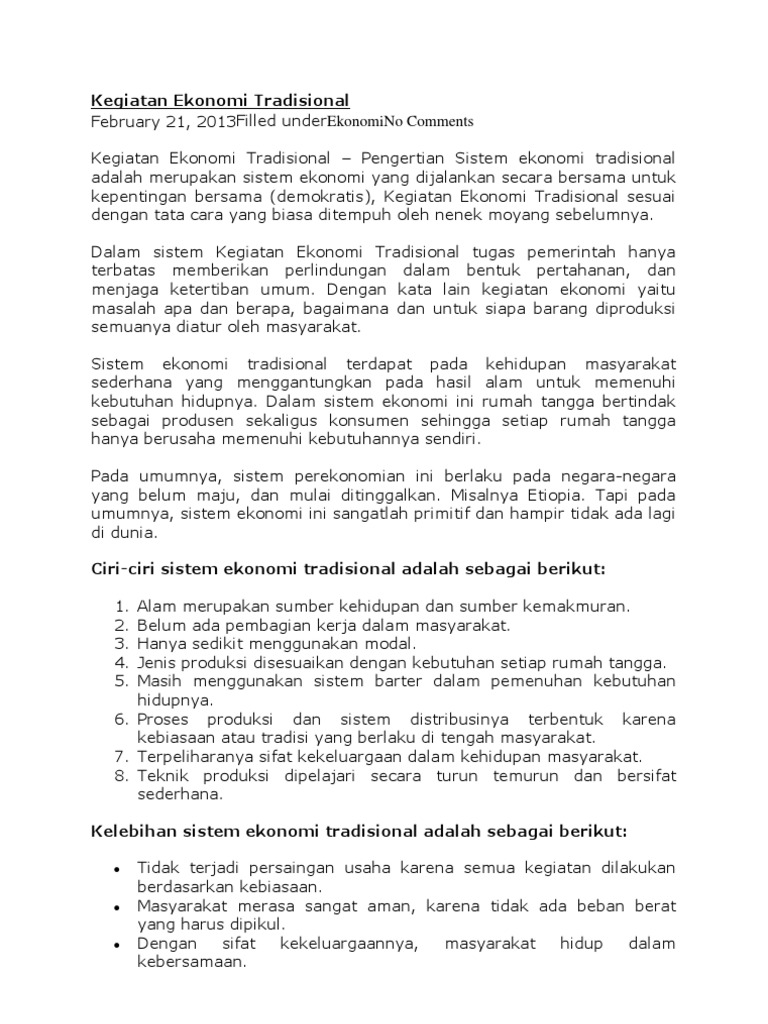 134802185 Ekonomi Tradisional from cdn.slidesharecdn.com Sesuai namanya, sistem ekonomi tradisional biasanya terdapat pada kehidupan masyarakat yang masih cenderung tradisional atau kuno. Sistem ini berpusat kepada keluarga atau suku tertentu yang menganutnya. (a) pengenalan kegiatan ekonomi utama. Pengertian kegiatan ekonomi adalah suatu kegiatan yang dilakukan oleh manusia untuk memenuhi kebutuhan hidupnya, umumnya kegiatan (a). Nah untuk lebih jelasnya simak. Sistem ekonomi pasar adalah sistem ekonomi di mana seluruh kegiatan ekonomi mulai dari produksi, distribusi dan konsumsi diserahkan. Ekonominya terbahagi kepada ekonomi tradisional dan moden. Pengertian kegiatan ekonomi juga dapat diartikan sebagai segala upaya yang dilakukan oleh manusia dalam mencapai kesejahteraan dan kemakmurannya dalam hidup.