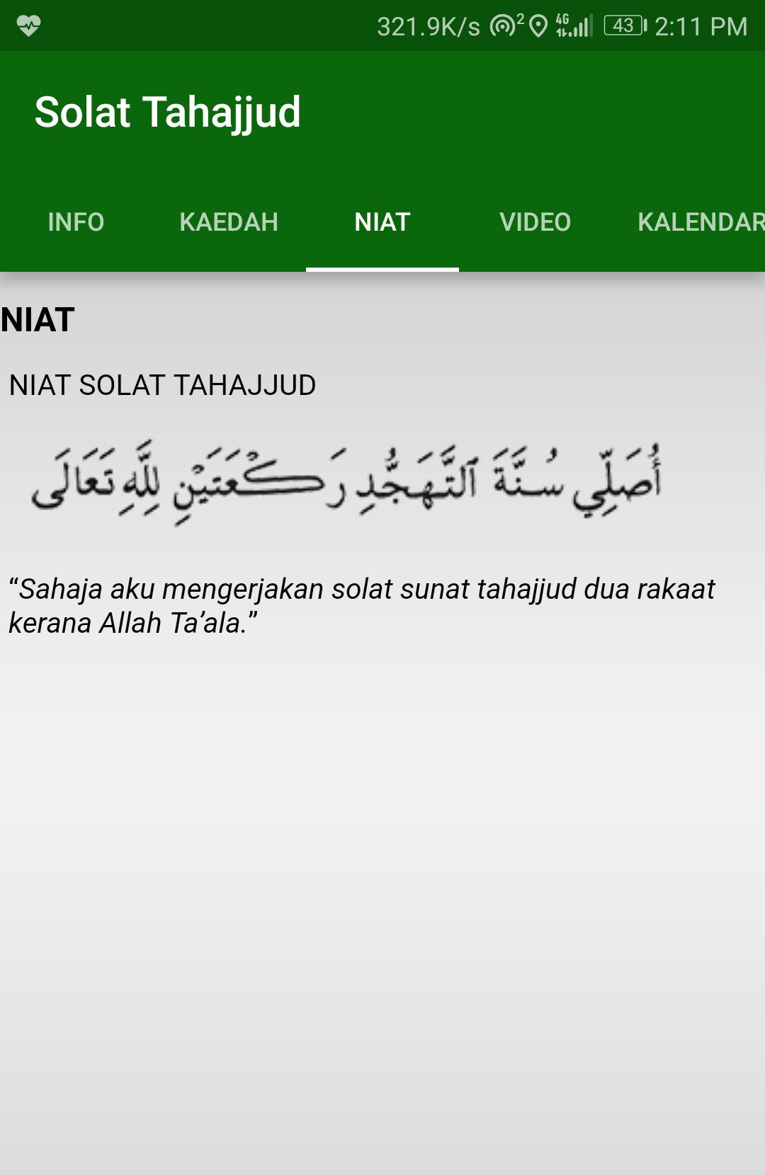 Solat Tahajjud Pour Android Telechargez L Apk from image.winudf.com Sholat tahajud merupakan sholat yang. Aku niat sholat sunat tahajud 2 rakaat, menghadap kiblat, karena allah ta'ala. 2. Bacaan latinnya adalah sebagai berikut: Seterusnya mengadap arah kiblat dan ucapkan lafaz niat solat solat tahajjud ini Salah satu ibadah sholat sunnah yang paling utama dikerjakan adalah sholat tahajud. Bagaimanakah cara untuk melakukan solat sunat tahajjud dan niatnya? Solat tahajjud adalah solat malam yang dilaksanakan setelah bangun tidur, afdalnya dibuat secara bersendirian waktu selepas tengah. Sholat tahajud dapat dilakukan sebanyak 2 rakaat, 4 rakaat, 6 rakaat, 8 rakaat, 10 rakaat, atau 12 rakaat.