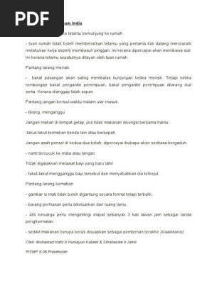 Pantang Larang Masyarakat Malaysia Docx Document from cdn.vdocuments.net Tapu) merupakan larangan keras terhadap suatu tindakan berdasarkan kepercayaan bahawa tindakan sedemikian terlalu suci atau terlalu terkutuk untuk dilakukan oleh orang biasa, dengan ugutan hukuman oleh kuasa ghaib. Kaum melayu dengan pantang larang memang tak dapat dipisahkan. Pantang larang & adat resam kaum india kematian ~gambar si mati tidak boleh digantung secara formal teapi terbalik. People interested in pantang larang kaum india also searched for. Masyarakat cina juga mempunyai pantang larang mereka yang tersendiri. 69%69% found this document useful, mark this document as useful. Walaupun kaum melayu, kaum cina dan kaum india mempunyai pantang larang semasa perkahwinan terdapat beberapa pantang larang yang perlu dipatuhi berhubung dengan kematian orang cina. Aspek perkahwinan selepas bertunang , bakal pengantin lelaki tidak boleh pergi atau keluar jauh dari rumah dibimbangi berlaku kemalangan.